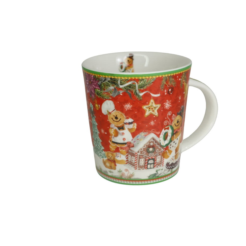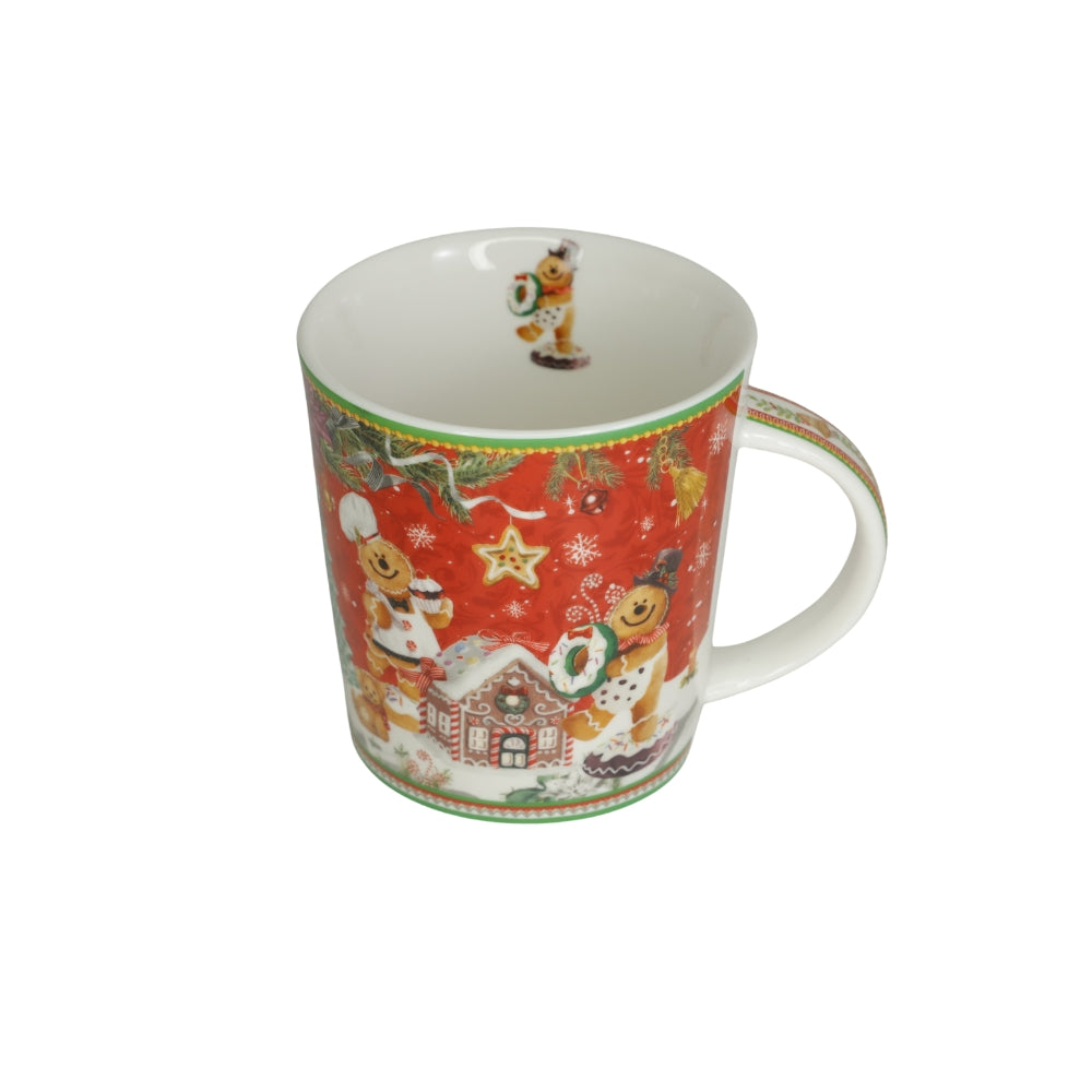 Imprimeul vibrant al canei ilustreaza oameni din turta dulce, fiecare detaliu fiind realizat cu maiestrie, de la glazura colorata la accesorii festive, care evoca bucuria Craciunului. Designul jucaus si culorile vesele transforma aceasta cana intr-un element decorativ care poate aduce un zambet pe fata oricui.