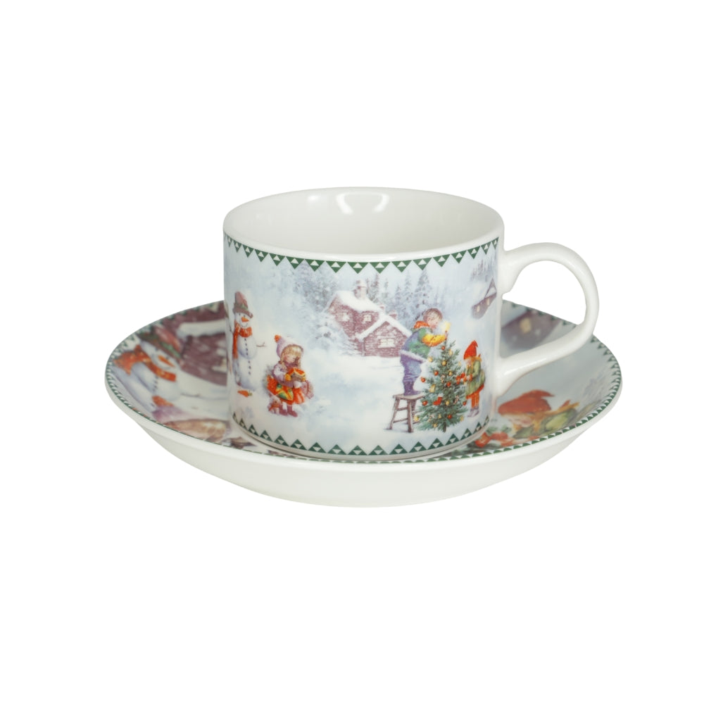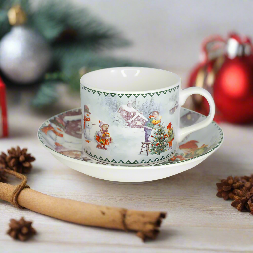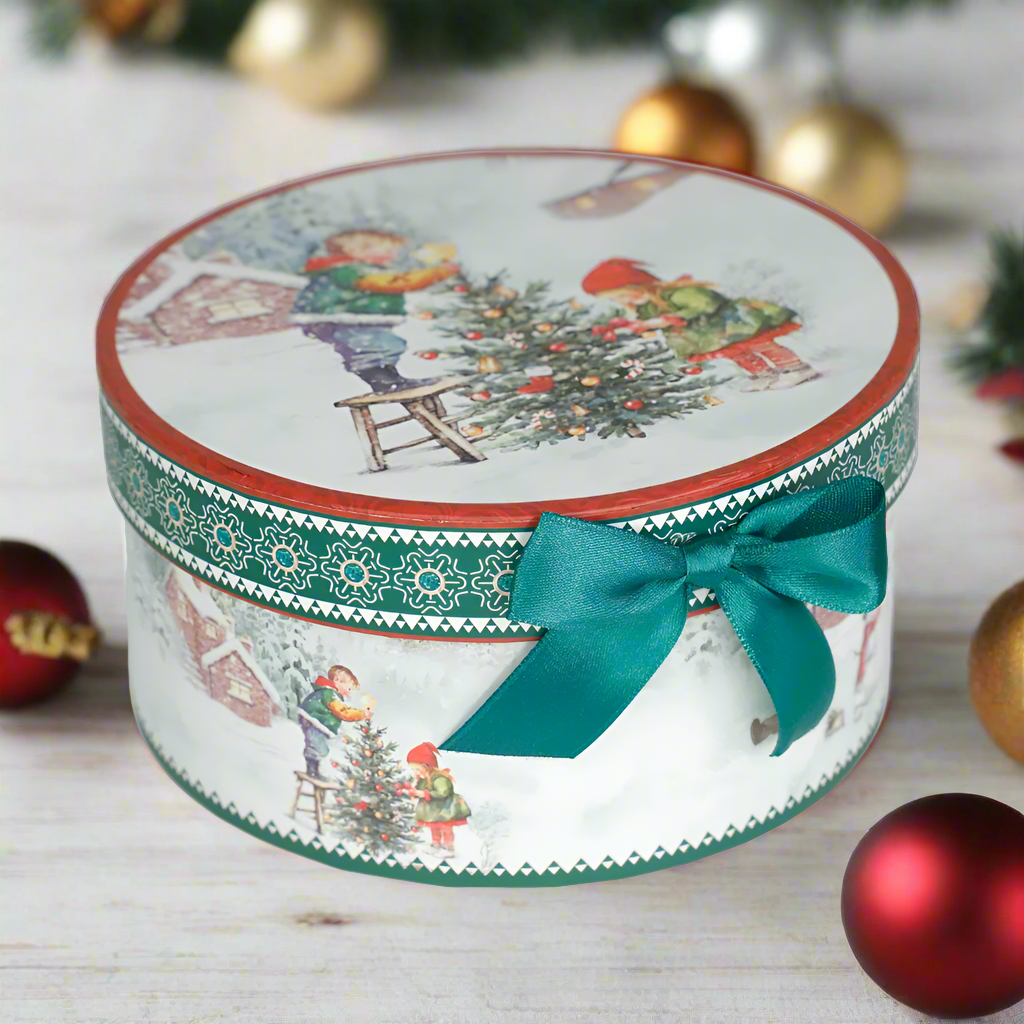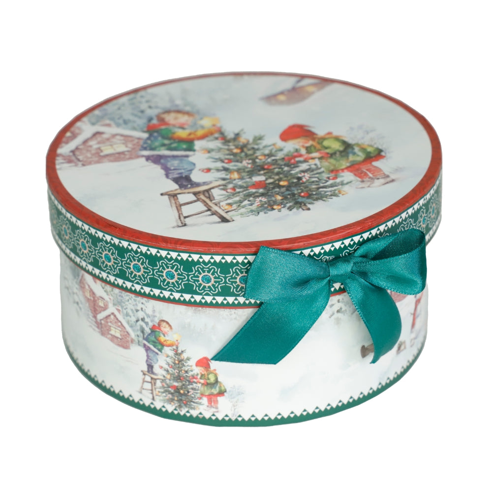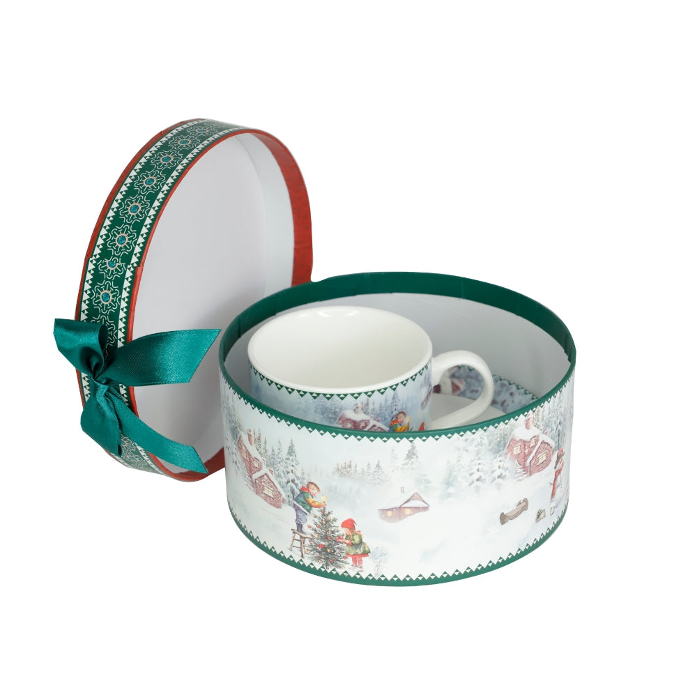 Cana din Portelan Craciun, in Cutie Rotunda Cadou, cu imprimeu Copii care decoreaza bradul de Craciun