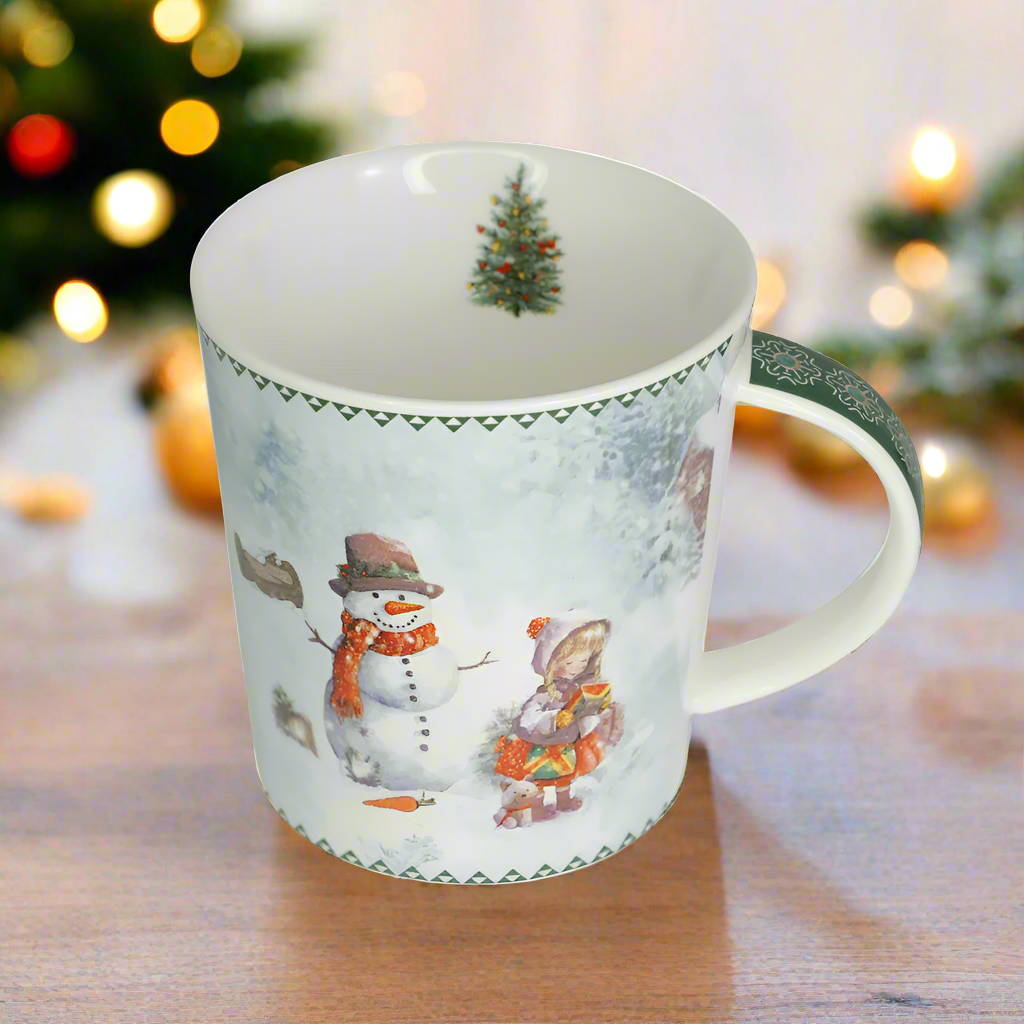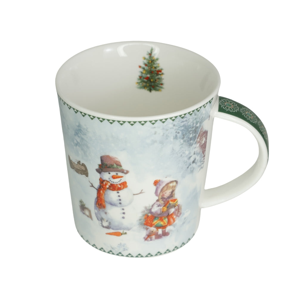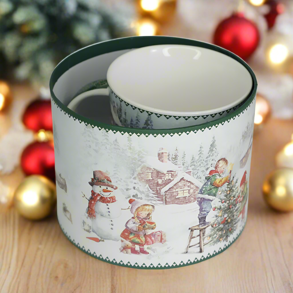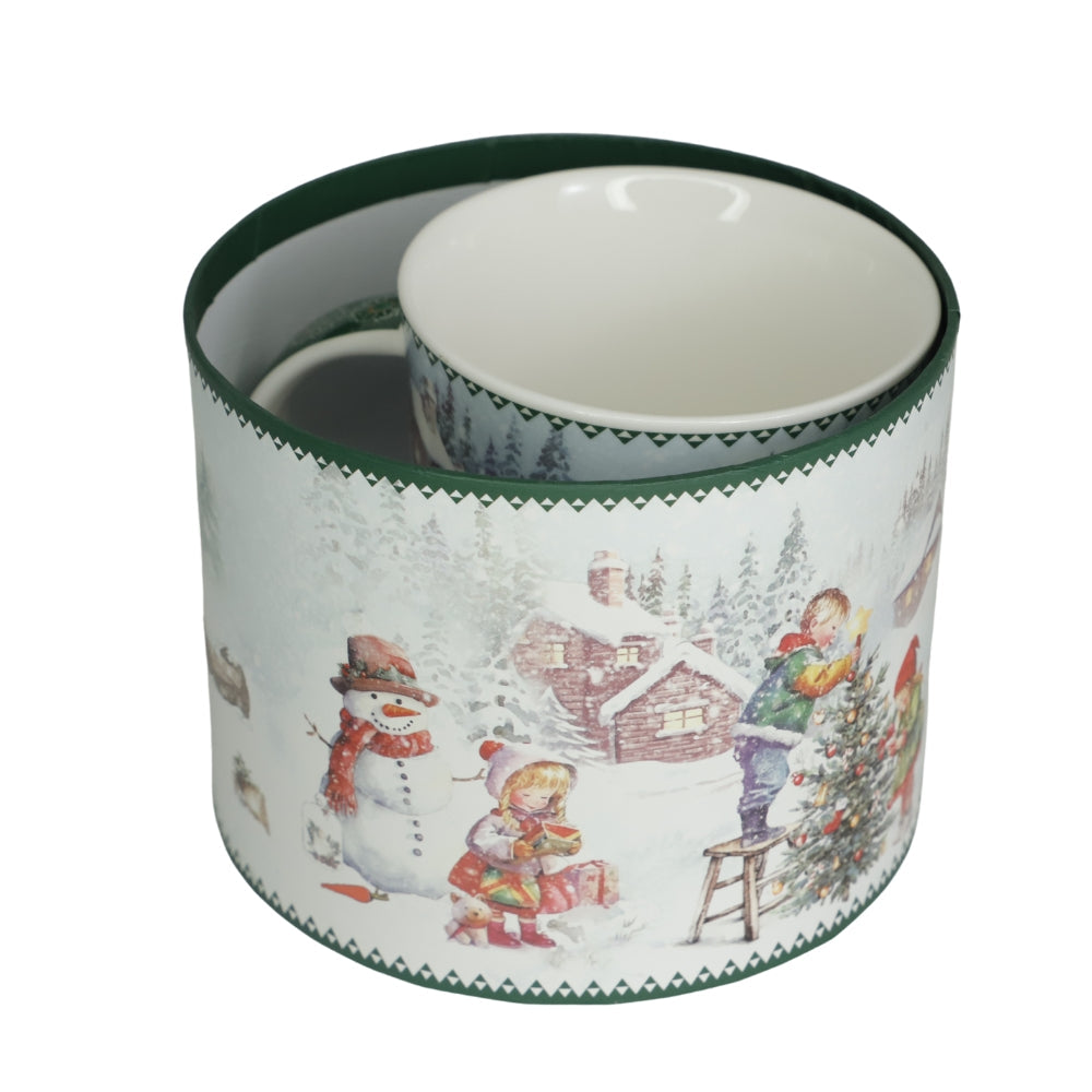 Cana din Portelan Cilindrica Craciun, in Cutie Rotunda Cadou, cu imprimeu Om de Zapada cu Copil