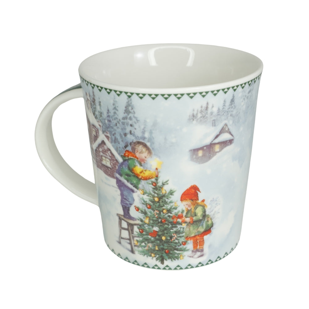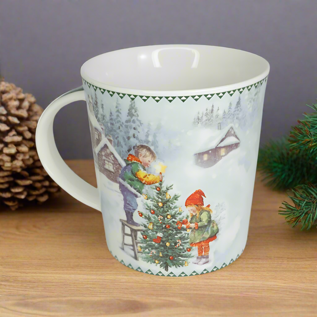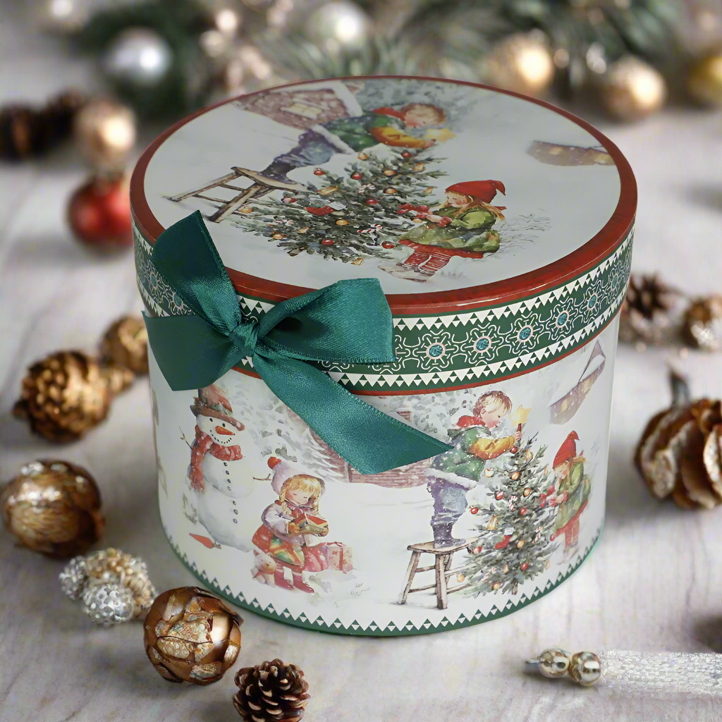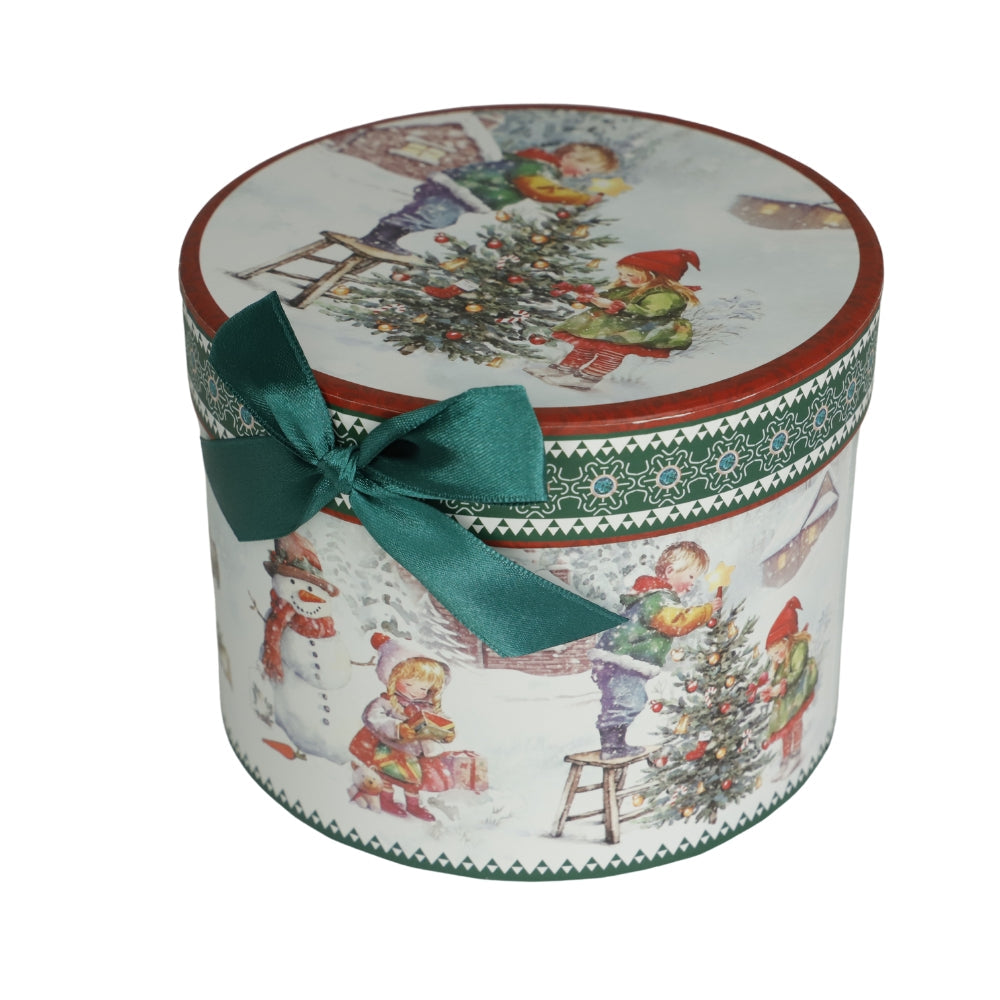 Cana din Portelan Cilindrica Craciun, in Cutie Rotunda Cadou, cu imprimeu Om de Zapada cu Copil