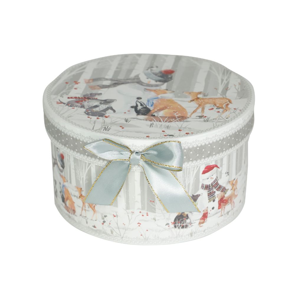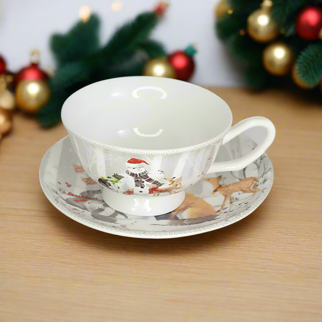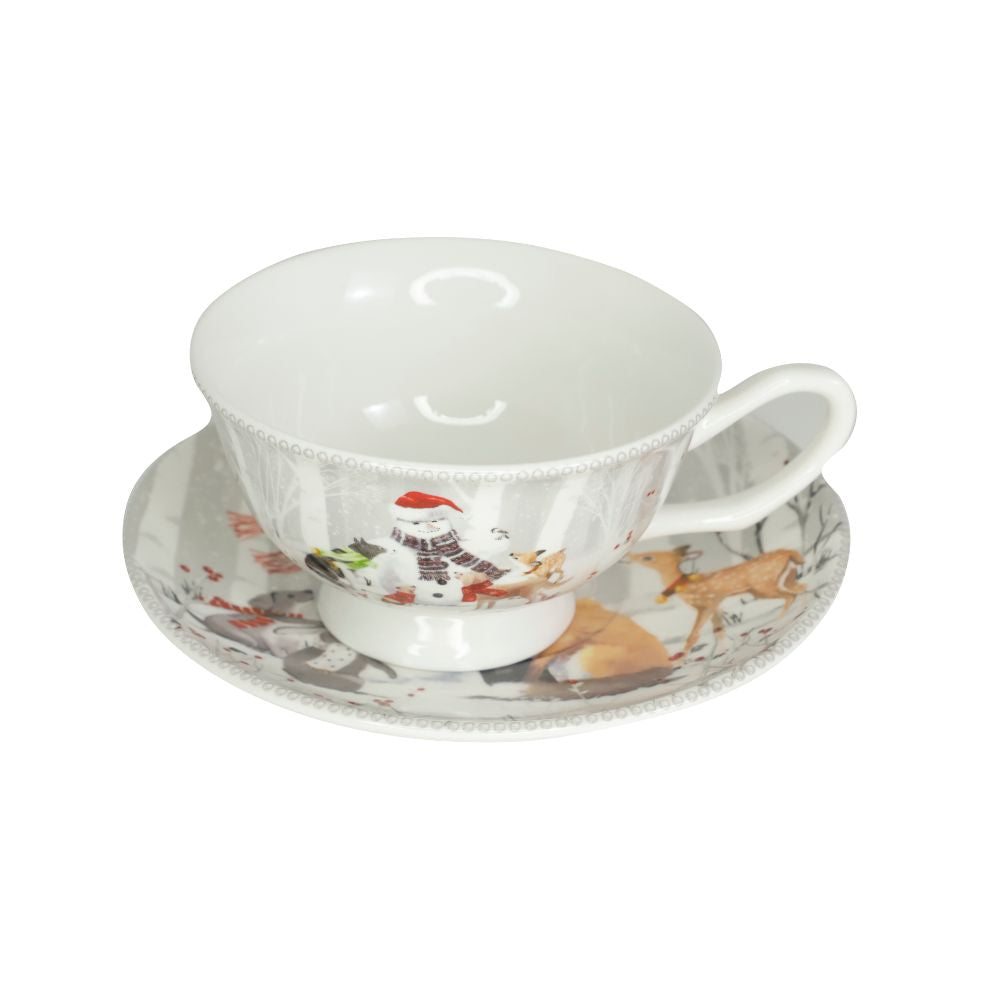 Cana din Portelan cu Farfurie Craciun, in Cutie Rotunda Cadou, cu imprimeu Om de Zapada cu Animalute