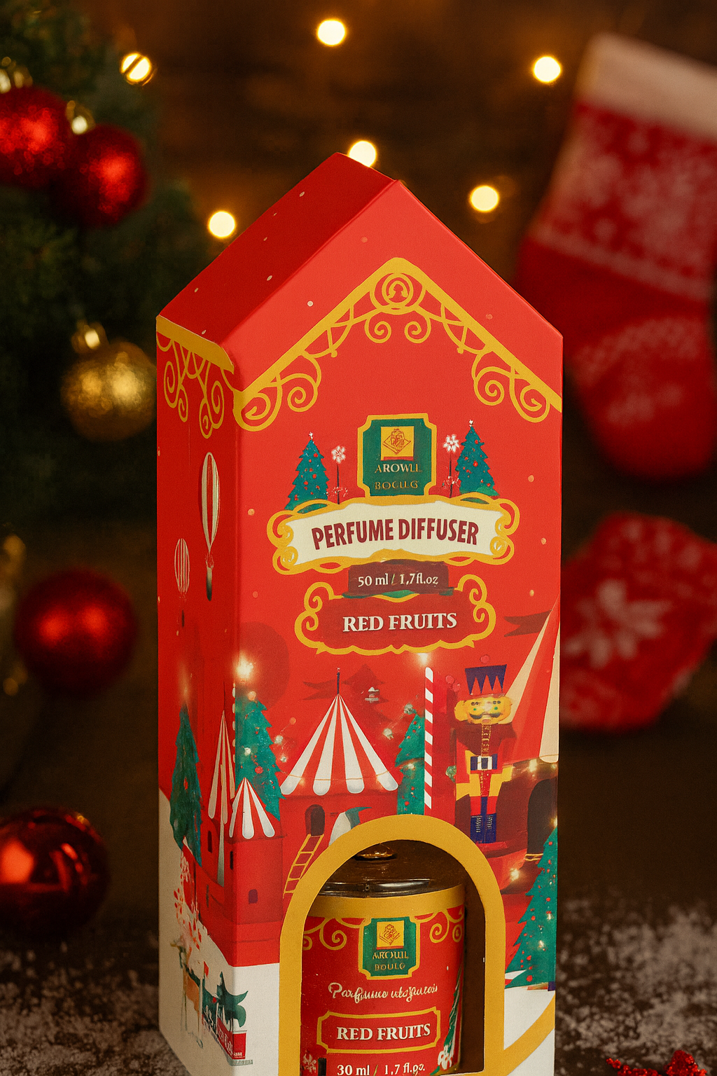 Ambalajul in forma de casuta de Craciun, decorat cu elemente festive si culori intense, transforma acest diffuser intr-o alegere excelenta pentru cadouri. Designul sau vesel si tematic completeaza armonios decorul de iarna, fiind potrivit pentru living, dormitor, birou sau hol.